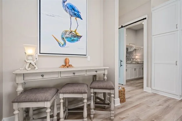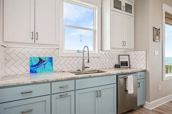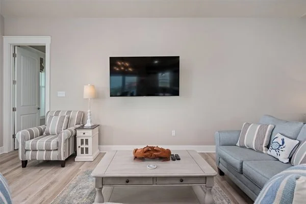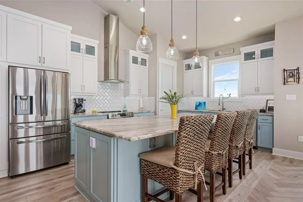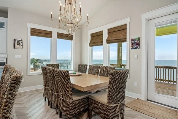 The fully equipped kitchen makes preparing meals part of the fun. With an island that seats four and a large dining table for eight, it’s a space made for connection. Whether you're grilling outside or cooking indoors with your fresh catch, every meal is better with bay views.